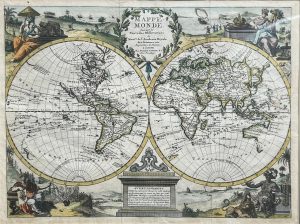 Antique world map titled ‘Mappe Monde, Suivant les Nouvelles Observations (..)’. Beautiful and relatively rare early 18th century hand-coloured twin hemisphere map of the world. This map originates from ‘Le Nouveau Theatre du Monde’ published by P. van der Aa, Leiden. The decorative vignettes of this map symbolize the four continents. The western coastline of New Zealand is illustrated, along with parts of Australia and Tasmania. The entire northwest coast of North America is blank above the peninsular California. There is a remnant of the coastline that suggested a connection between North America and Asia on earlier maps; here with a notation concerning the discoveries of Vasco de Gamma. The eastern coast of Asia is truncated and a huge Terre d’Yeco forms the northern part of Japan.