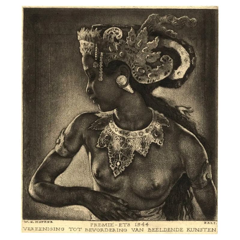 - Signature and Text: Signed “W.G. Hofker” along with “Bali,” “Premie-ets 1944,” and “Vereeniging tot Bevordering van Beeldende Kunsten” engraved in the plate below the image.